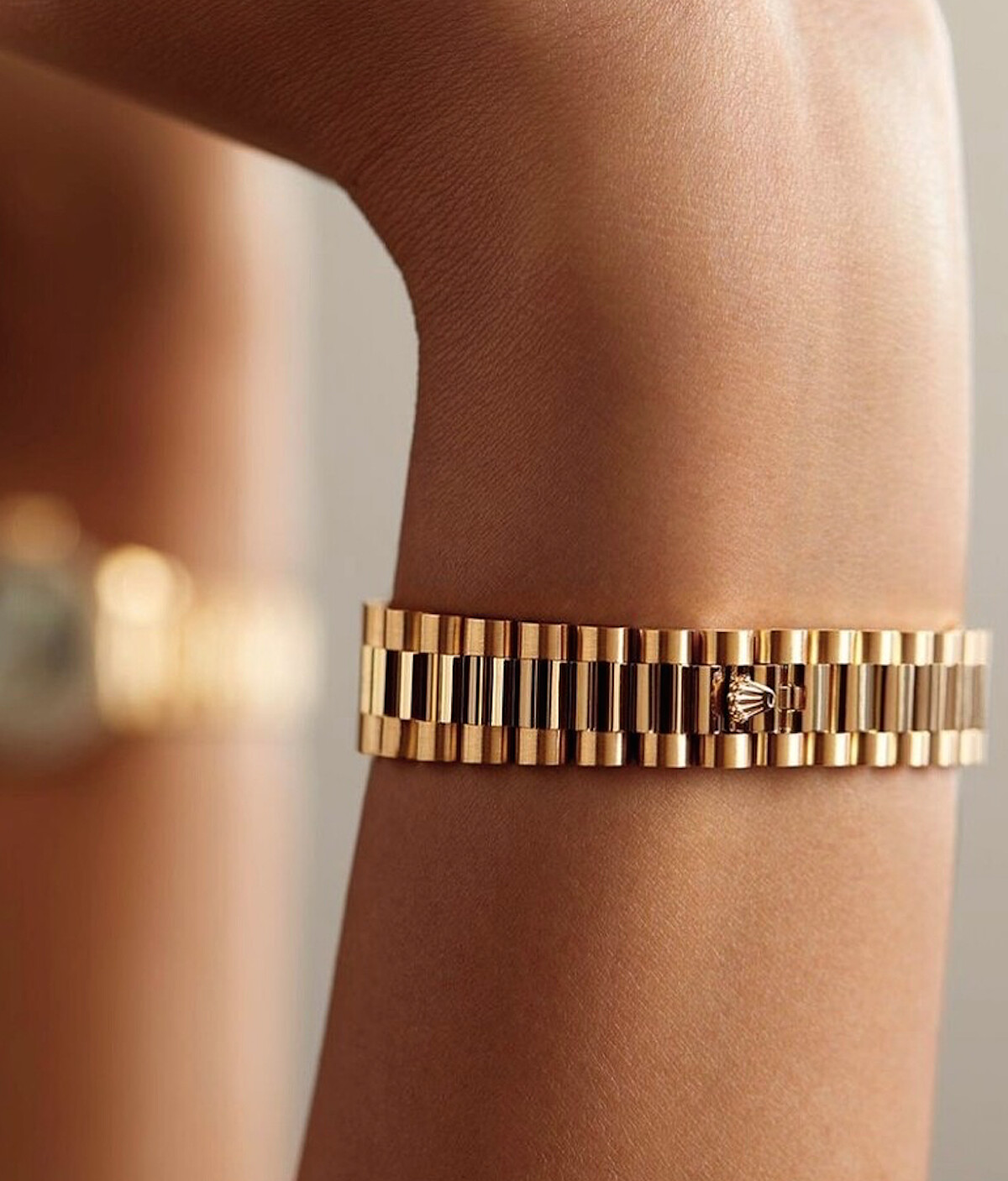 元首型(President)錶帶也被錶迷們稱為總統帶,鏈節與蠔式錶帶同樣也為三格交織而成,最大的不同在於左右兩側的鍊節為「拱形」;錶帶最早於1956年專為Oyster Perpetual Day-Date腕錶推出,值得注意的是,元首型錶帶大多數以貴金屬打造,如實呼應名稱的不凡氣度與優雅風格。