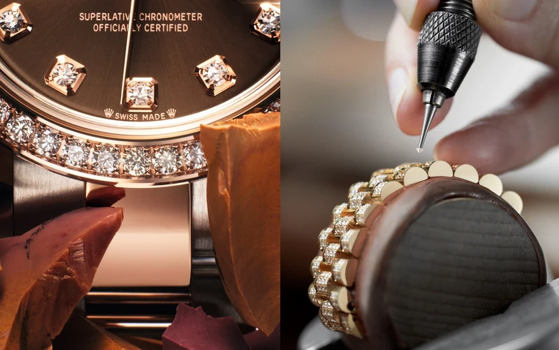 另外,備有多種材質、顏色、花紋與羅馬數字或阿拉伯數字等多款鐘點標記的選擇,也可搭配繽紛的鑲鑽鐘點標記與鑲鑽錶面。除了經典的香檳色、銀色、白色、粉紅色與鑲鑽錶面,珍珠母錶面更是獨具特色;其中,透過技藝精湛、精通各種專業鑲嵌技法的勞力士寶石鑲嵌師,除了寶石本身的品質外,更嚴守數項精密工藝!從寶石的齊整排列、鑲嵌的堅固性,座向位置,以及最終的珠粒修飾等,都建立勞力士寶石鑲嵌技藝的美譽!
