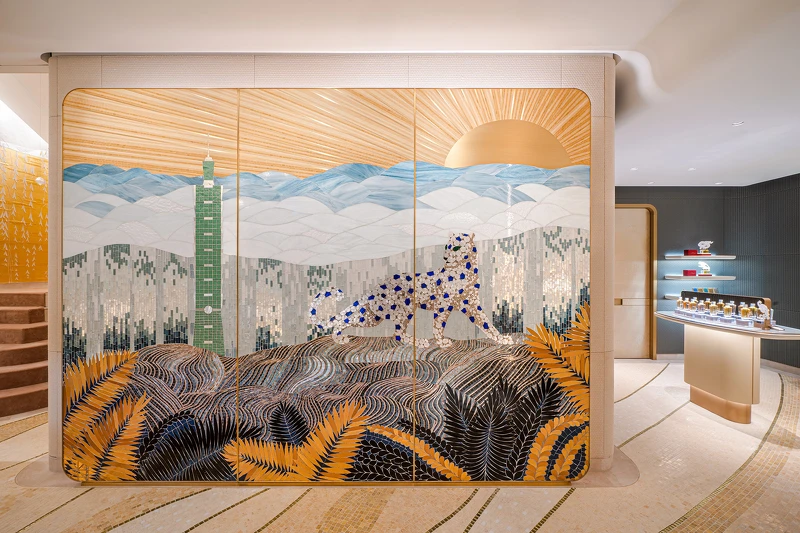 首先,3樓迎賓空間金質色調點綴青金石色打造鮮明的對比,吸睛度滿分的珠寶壁畫,則是由馬賽克藝術家 Mathilde Jonquière專為為台北101旗艦店所訂製,描繪夕陽西下台北絕美天際線,蓊鬱山林與茶園梯田,加上藍寶斑點的美洲豹閒立雲中的元素,象徵卡地亞Cartier與台北攜手同行的意念,也完美與卡地亞Cartier在馬賽克鑲嵌製錶工藝上卓越表現的對照。