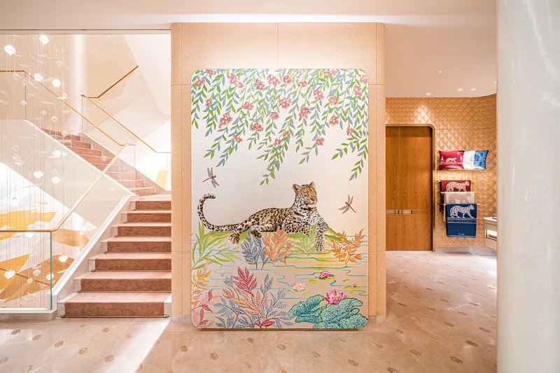 拾級而上的4樓,以最能襯托卡地亞的尊貴高雅本質的鮮紅、粉彩色與金色飄逸著柔美仙逸氣息,牆上夢幻聯動的台灣梅花鹿與美洲豹,是由英國奢華室內牆飾品牌De Gournay手繪而成,將各式陶瓷原料以獨到眼光來組合紙底材料、裝飾細節、顏料與配色,創作不同時期的手繪壁紙…與卡地亞Cartier透過手繪與異材質結合融入珠寶鐘錶上的工藝,相互輝映齊聚在一起,更顯珠寶純粹且強烈的出塵之美。