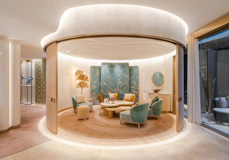 當踏進5樓空間,柔和靜謐色調與華麗豐富材質完美結合,注入當代時髦氣息。有如居家空間的貴賓室中,圓形弧線與湖水綠、淺鵝黃色調打造舒適愜意氛圍,使人可以在這以最自在的姿態一一鑑賞卡地亞各款珍稀華美的傳世之作。