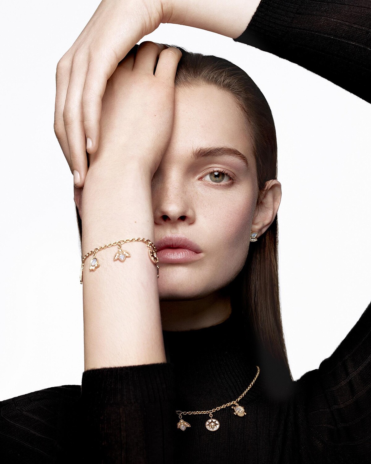 今年,Victoire de Castellane 為 Rose des Vents 迎來了一場繽紛的奇幻之旅:系列中包含紅玉髓、青金石、綠松石與孔雀石打造的雙圈式耳環;Rose Céleste 則以微笑太陽與沈睡月亮的趣味圖案,呈現於直徑 25 mm 的圓章吊墜上。另一款設計搭配 16 個羅盤玫瑰造型墜飾的多層次項鍊,色彩活潑璀璨,另有垂墜式耳環與多層次手鍊運用相同的設計元素。作品以金質穀粒紋鑲嵌,使孔雀石與青金石和具異國情調的綠松石交織出動人舞步,相互輝映的還有粉色蛋白石、橙色紅玉髓、黑色縞瑪瑙與金棕色虎眼石。採用珍珠母貝打造的玫瑰、蜜蜂與鈴蘭墜飾,皆是迪奧先生珍愛的標誌性元素,他甚至會在發表時裝秀當天將鈴蘭花縫入禮服裙擺。一款宛如幸運符的項鍊與手鍊作品點綴多個吊飾,有雙心、骷髏頭、羅盤玫瑰、蜜蜂、鈴蘭等圖案。其中,蜜蜂與鈴蘭兩款幸運吊飾也以單獨的耳飾造型呈獻。