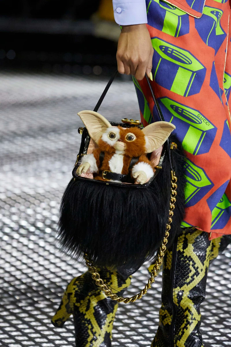 最吸睛的配件則非小精靈絨毛布偶莫屬,取材自1984年由名導史蒂芬史匹柏執導的電影《小精靈》,可愛的形象被運用在服裝印花、腰間配飾及包包上,電影中小精靈一碰到水就會增生複製,甚至會在午夜變成惡魔的特質,無形中也呼應了本季強調的雙生概念,以及長相相同但靈魂各異的命題。一款複刻自1981年推出的馬鞍包則更是貫穿全系列,簡約的輪廓與優雅的氣質,絕對會是明年的IT Bag!