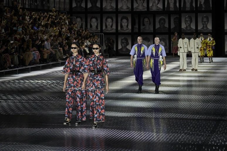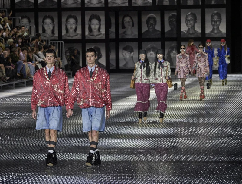 承接這樣的命題,時裝秀在一座貼滿雙胞胎大頭照的空間裡登場,歌手 Marianne Faithfull 朗誦著時尚雙胞胎姐妹花 Olsen Twins 小時候唱過的<Identical Twins>歌詞,”I am me, she is she. Except when I pretend I'm her. And when we switch, you can't tell which is which. You don’t know who you're talking to, cause we're identical, identical, identical, identical twins.” 模特兒魚貫登場,設計一如 Alessandro Michele 慣用的手法,68套服裝融合各種不同時空、文化內涵、民族風元素的風格美學,以解構、重組、混搭的多元方式拼接出流露復古情調的當代造型,有大膽斑斕的幾何色塊、有溫婉又艷麗的中式旗袍及和服輪廓、有張牙舞爪的 Cyberpunk、有華麗精緻的非正統正裝設計、也有青春動感的刺繡細節運動裝扮,各式華麗的流蘇面紗、垂墜珠串裝飾、浮誇造型墨鏡等設計,則為系列增添戲劇張力。