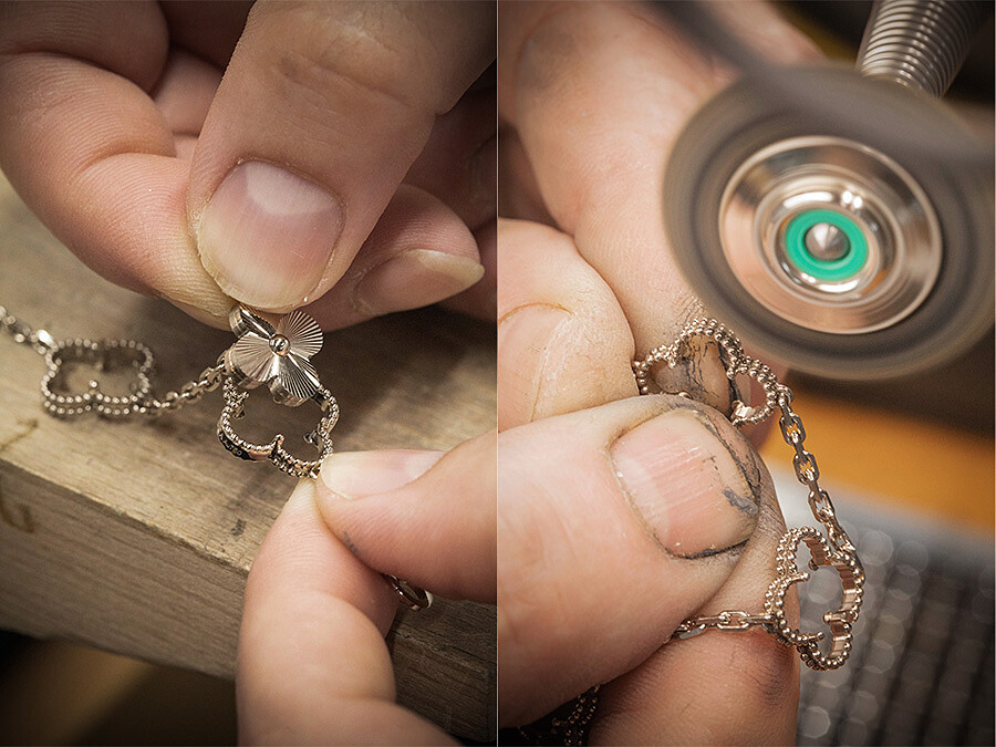 延續Vintage Alhambra系列傳統風格,透過大師級珠寶匠悉心加工,使得珍貴圓珠有著完美圓潤飾邊,再細心調整鑲爪將圖騰固定、拋光潤飾,讓迷人新作皆綻放出美不勝收的流光溢彩。早在1910年代便被世家應用的璣鏤雕花工藝,從初始的錶盤、1930年代的匣子、粉盒及Minaudières百寶盒,替鑲嵌寶石的珍貴金屬鍍上太陽放射飾紋的璀璨流光,這次新作在金質素材表面鐫刻放射飾紋,照映出如暖陽映照的流麗光彩,更是完美展現了Alhambra系列原創風格。