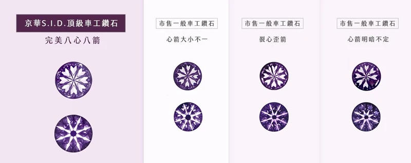 京華SID頂級車工鑽石除了藉由車工比例散發傲人光彩之外,每一顆更含有由58個刻面所構成,飽滿對稱的八心八箭設計,比起許多市售車工鑽石常見的心箭大小不一或是明暗不明,京華堅持呈獻完美的八心八箭比例,並提供觀鑽鏡即能輕易一窺正面的八支箭與反面的八顆心,也正是此經過計算的刻面構成,令八心八箭成為最能夠讓鑽石在透進自然光後,折射出最完美動人的璀璨光芒。