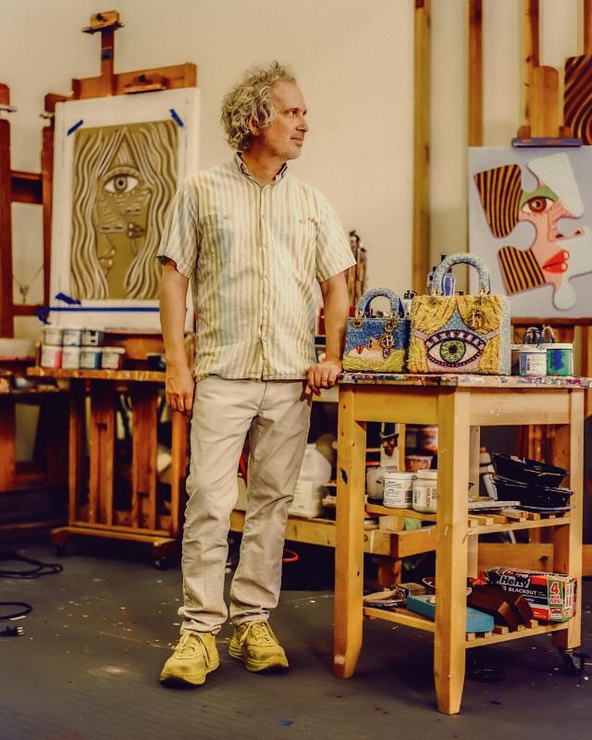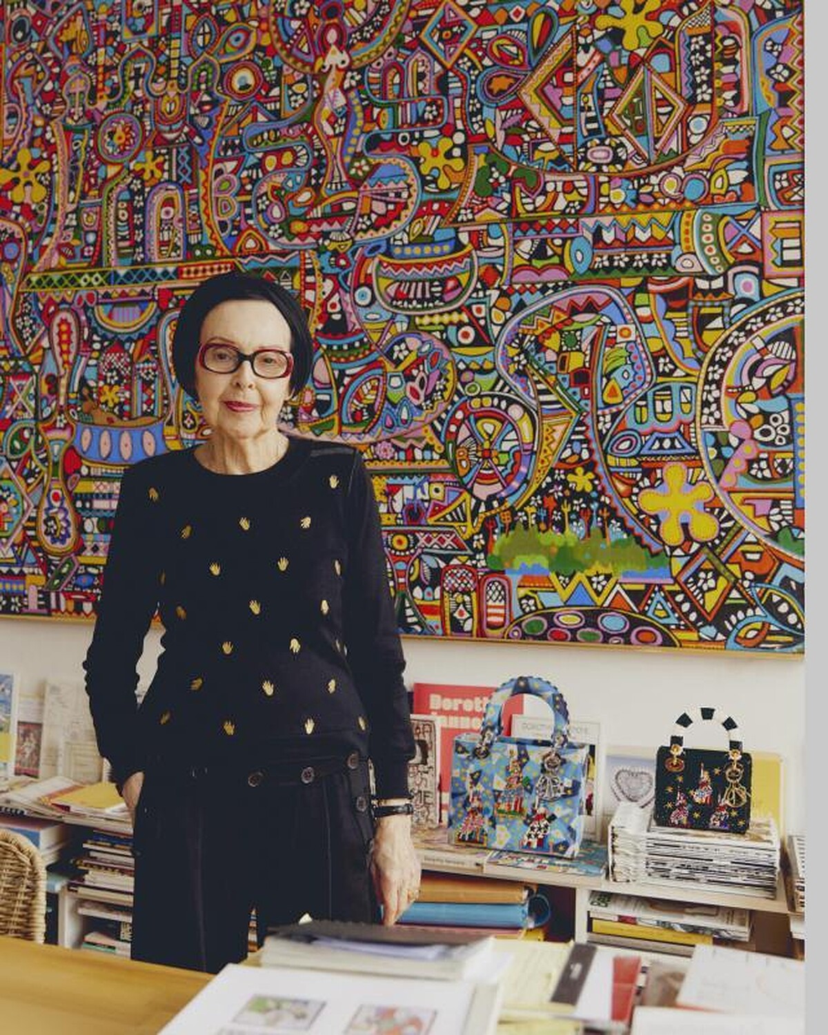 他將自己一幅經典作品轉印到 Lady Dior 提包上,大膽實驗顏色與素材,成為效果多變的迷人畫作,象徵手掌與柔軟織物之間的接觸,似乎與金屬光澤皮革完全合而為一。藝術家細膩的立體刺繡圖樣取代經典籐格紋,最後的驚喜深藏於包內,獨特而精緻的提包內部是奔放的鮮紅色,迪奧先生口中的「生命之色」。這件作品以詩意的鮮明對比,在優雅和大膽之間達成完美的平衡。