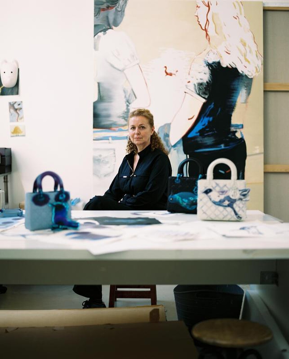 在她作品中反復出現鳥類,也成為這次創作 Lady Dior 的主軸,貫穿了三款作品。第一款以白色霧面皮革為畫布,宛如在紙張上勾勒線條,翻新籐格紋圖騰。逃脫的鳥兒猶如飛行中嘎然靜止,在光影交織的尾端則略微突出提包。另一款黑色的提包上則有一隻沈睡的鳥兒。第三款提包則是小型紮染版本,昇華了她畫作中的色調與光影手法,鳥兒化為幸運吊飾。最後這個幸運符的小巧思是用帶有鏡面光澤的布料所縫製,化身為創作的完美句點,也是一趟自我探索的起始點。