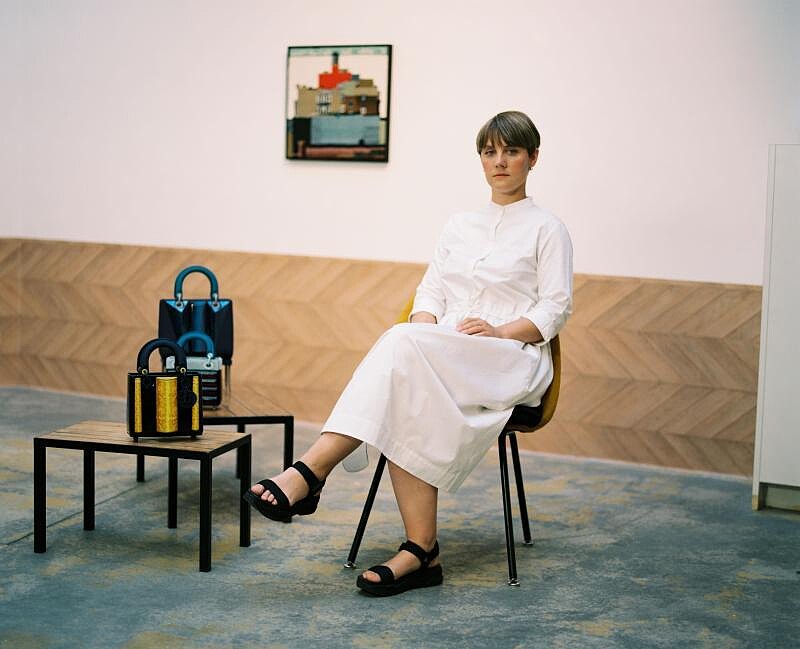 她將兩款 Lady Dior 詮釋打造成時代的共同見證者,試圖捕捉時間流逝的感覺。其中一件提包上蒐羅了網路圖像,年代橫跨19至21世紀的照片,具有象徵性且效果各異、有印刷品亦有逼真的刺繡,利用 Dior 經典籐格紋成為展示圖像的珍貴背景,高調凸顯紅色皮革。另一件作品有如迷你藏寶閣,在明亮的黃色背景下,將圖像封存於透明 PVC 之中。搭配的肩帶裝飾著這些新奇的「畫作」。最終的驚喜在提包內部:陰天般詩意的色彩,彷彿邀請人們遁入夢境與現實交界的虛實空間。