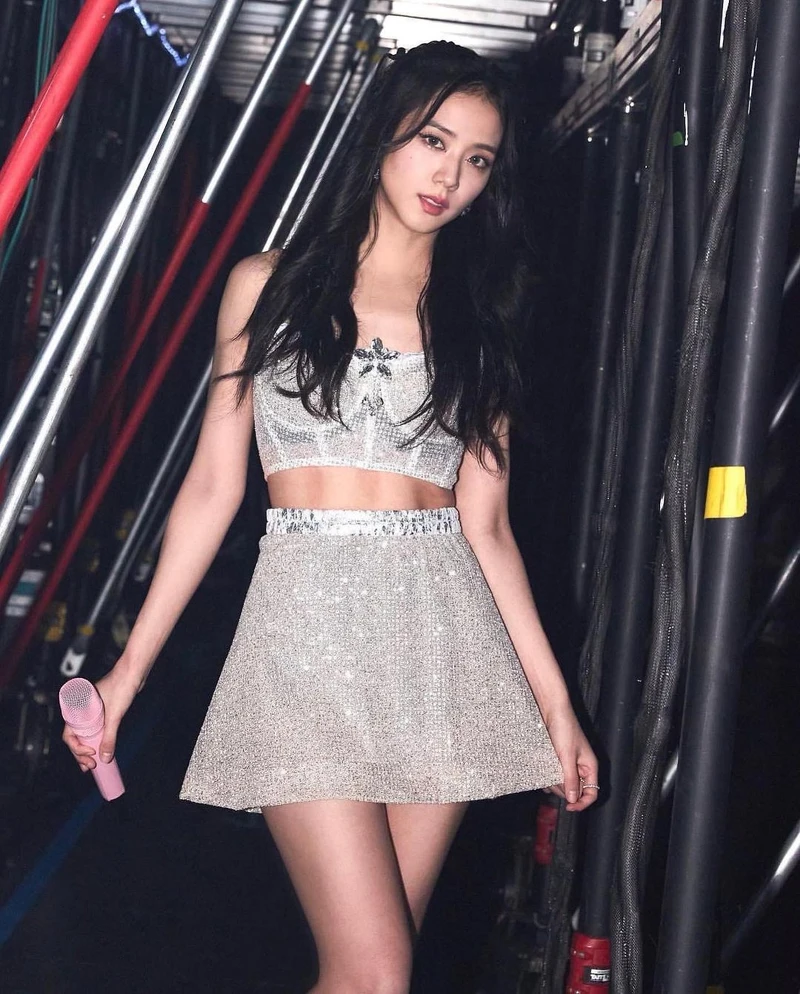 精心挑選的亮片緊身馬甲式上衣、亮片迷你裙,讓Jisoo化身小公主,這套要價約30萬台幣。