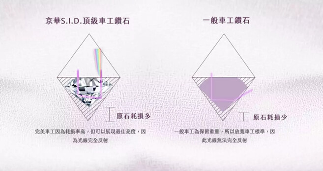 台灣首創[裸鑽自由挑品質透明化]的選購方式就非京華鑽石莫屬,主打「京華SID頂級車工」(Super Ideal Diamond),完美飽滿對稱的八心八箭,車工優於GIA 3EX更超越12EX,是唯一對外公布鑽石各角度比率,透過數據及官方驗證,精密嚴苛計算出最佳比例與角度、嚴謹安排58刻面,只為了讓光線不論從哪個方向照向,都能被反射進入眼簾,發揮極致光澤,才能夠折射出最動人的閃耀光彩,成為世上最炫最亮的[京華SID頂級車工鑽石]!