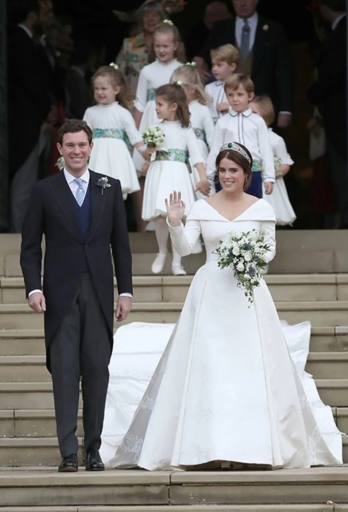 尤金妮公主(Princess Eugenie)大婚時身上穿著由她與英國設計師Peter Pilotto和Christopher De Vos設計的婚紗,價格約200,000英鎊,折合台幣約7,909,812元,婚紗上加入代表這對蘇格蘭薊、愛爾蘭三葉草以及代表夫婦家的約克玫瑰和常春藤等細節,更在婚紗背面以V領設計展示小時候背部脊柱側彎手術留下的疤痕!