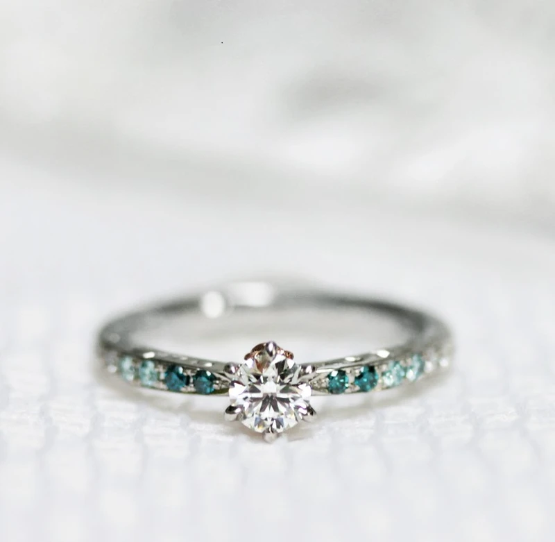 海洋的清澈廣闊不僅令人心曠神怡,夢幻般的淨藍色彩也深受許多女孩喜愛,M編第二款要推薦的就是以海洋的蔚藍色調象徵愛情的Blu Puro系列,系列的名稱其實就帶有淺碧藍色的涵義,K.UNO特別選用名為「海之滴鑽石」的淺藍色配鑽,美麗清澈的碧海珠滴充滿細膩獨特美感,左右擁護著中央的純淨美鑽,在海水與陽光的見證下,將兩人的純粹愛情合而為一,在細節中透著低調的可愛浪漫,將美好祝福傾注設計之中,以指間的約定守護著永恆無瑕的愛情。
