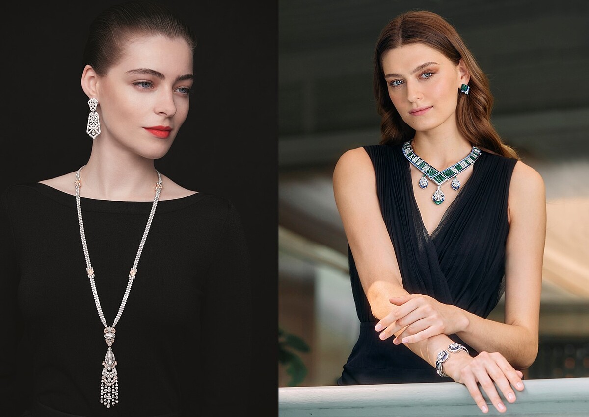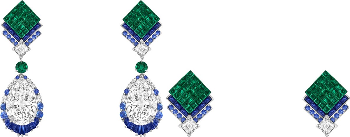 Chevron Mystérieux項鍊是Legend of diamonds高級珠寶系列代表作之一,靈感來自1950年代疊襟式晚裝的時裝元素。三顆碩大雍容如露珠般的梨形切割鑽石,流淌於色彩斑斕的寶石之間。圓形和方形切割鑽石在項鍊上交纏,構成層層遞進的精妙效果,恰到好處的線條形狀完全不顯厚重,三顆璀璨寶石互相輝映,點亮項鍊上的藍寶石和Mystery Set隱密式鑲嵌祖母綠。加上薈萃了世家寶石、珠寶工匠繁複的鑲嵌技術,將祖母綠碧翠圓融的色澤發揮得淋漓盡致,與藍寶石的深邃藍調相映成趣。
