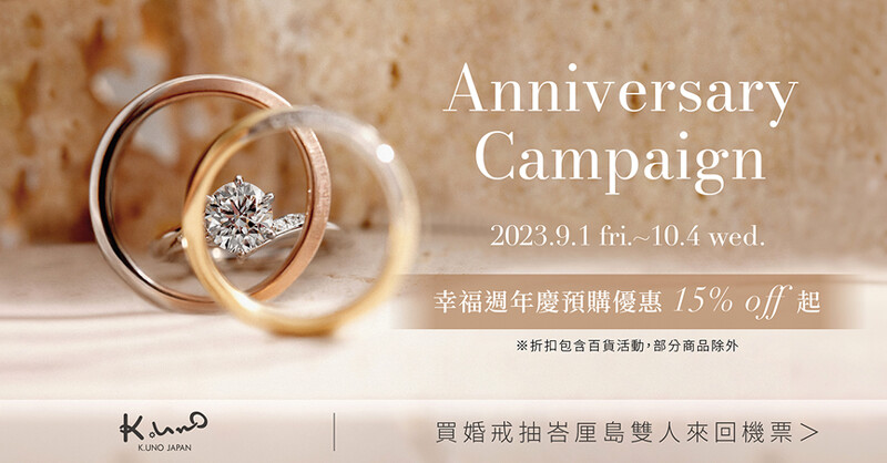 當然還有大家最關注的K.UNO幸福週年慶活動內容,即日起到10月4日消費滿5,000元享500元回饋,刷卡可再享刷卡禮;購買指定美鑽則可享有15% off 起的超值優惠(折扣包含百貨活動,美鑽數量有限);另外還有9月1日到9月30日期間的限定特典,只要預約諮詢並下訂婚嫁系列即可抽峇厘島雙人來回機票、鑽飾等幸福好禮!想購買婚戒或替自己入手一款璀璨鑽飾的大家當然不能錯過!