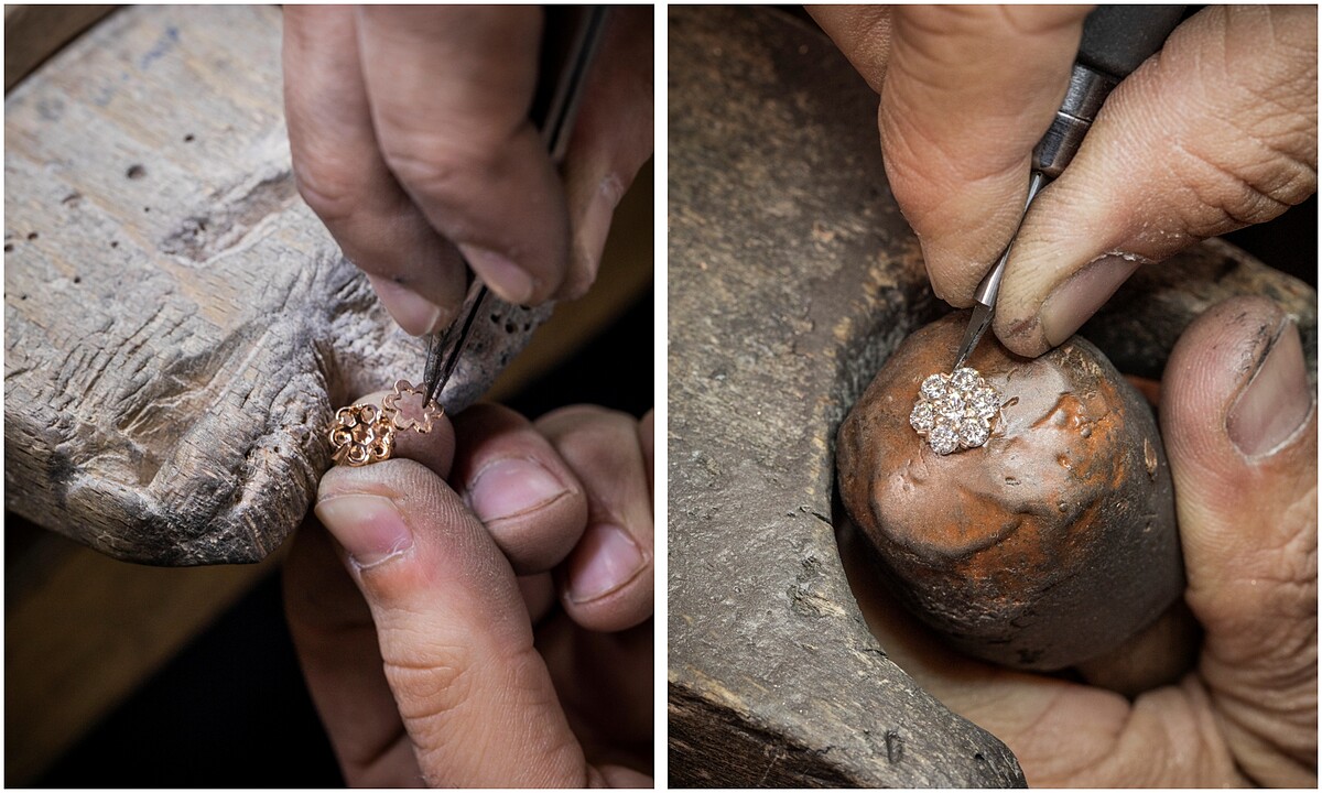 世家的珠寶工匠為了Fleurette系列更是各施本領,利用鏤雕工藝巧妙地將底座結構鏤空,令光線得以穿透圓鑽綻放燦光,隱密鑲座巧妙運用粒鑲及「V」形鑲爪技術,令每顆鑽石彼此緊貼交織炫目光暈,最終再經由反覆拋光締造小巧卻擁有極致璀燦光華的唯美之作。