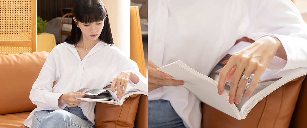 選擇不同作品並透過搭配展示個人風格,是郭源元在成為獨立女性之後的體悟,因為對自我的了解,而更能掌握自己喜歡的風格與希望呈現在眾人面前的樣貌,選擇能與KOKOROBOSHI疊戴的MANI HALF永恆戒,精緻緊密的排鑽相比單鑽戒指來得低調,但又能在每個角度散發著璀璨光輝,也呼應戒指背後的設計意念,「MANI」是掌管月亮圓缺的美麗女神,在夜空中以純淨月光照亮大地,能夠無私地照耀著主鑽,相互襯托並綻放出最美麗的火光,而永恆戒則是代表「永遠」之意,I-PRIMO精選大小一致、品質均一的美鑽,以不間斷的鑲嵌排列,讓戒指成為「永恆的愛之象徵」。