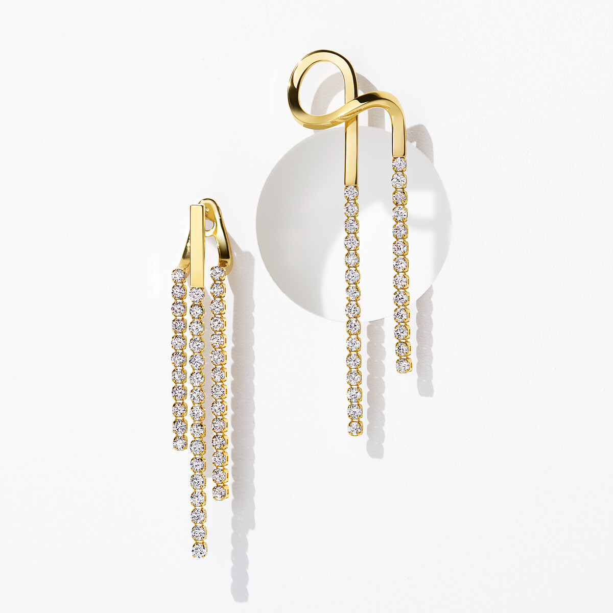 設計為沿著耳垂邊緣的貴金屬線條,延伸一排排鑲嵌著璀璨鑽石的網球鏈,隨著耳際頸間柔美的姿態擺動,不僅散發滿滿的輕盈活力,更增添俏皮的魅力風格。
