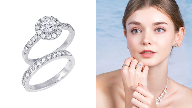 推薦理由:市場上最卓越的求婚戒指,圓形主鑽搭配小鑽外圍,閃耀著愛情的光芒。主鑽被小鑽環繞,不僅放大主鑽,也使其更加耀眼,突顯對愛人的承諾,象徵著永恆的愛情。此款鑽戒可以搭配經典鑽石線戒做為結婚時交換的信物。