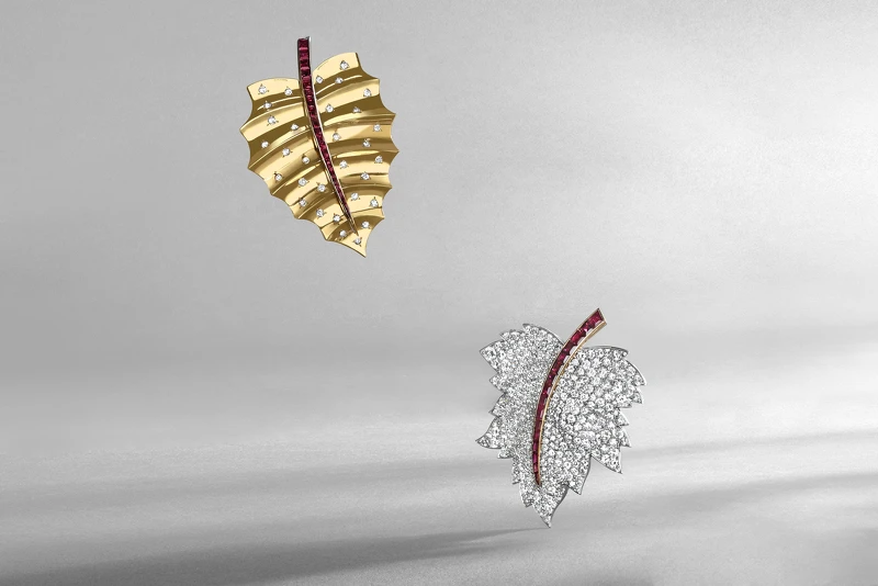 1947年面世的Leaf胸針,同樣以方形紅寶石組成線條纖細的葉片中央主脈,黃K金將寶石細膩包鑲,葉片表面鋪鑲美鑽,彰顯世家在戰後回歸19世紀末崇尚寫實自然的工筆風格,和煦金光與紫紅寶石炫彩輝映,如初冬暮雪為落葉披上銀妝,展現循環往復的自然奇觀。