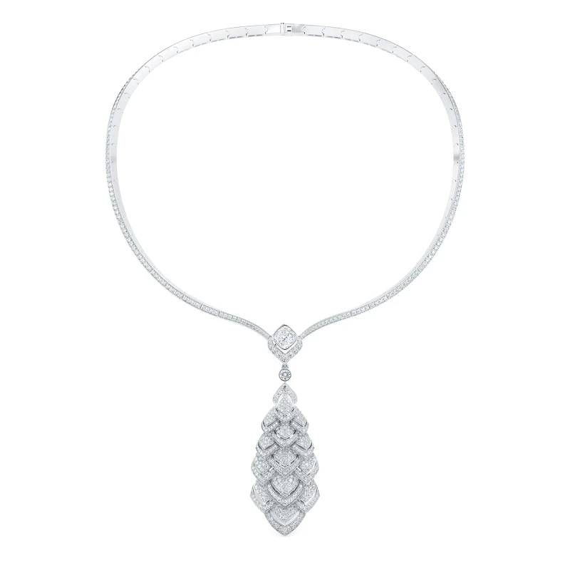 此次她配戴The Alchemist of Light高級珠寶系列的Midnight Aura套鍊,該系列以夜空中閃閃發光的極光和宇宙星塵為靈感,其中,鑲嵌鑽石和非洲蛋面綠玉髓的網狀領片項鍊尤其考驗工藝,如蕾絲衣料般柔軟的結構,是由精湛的鉸接金工和逾百顆鑽石構成,並採用隱藏的拆卸機關,讓項鍊能於領片、單行鑽石項鍊之間轉換,如此極致工藝,恰也呼應了陳妍嵐對花藝細節的要求,不管是宴會策展還是獨立花束,她笑說自己是從花朵到緞帶、每一細節都不放過的精準派。