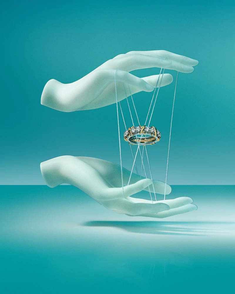 動態影像更是能彰顯當代創意視角的絕佳途徑,縮小版到放大版的各種模型在畫面轉換下無縫銜接,並融入取材自現實生活的趣味場景。而那些令人目眩神迷的華麗轉場,也非出自後製特效,宛如穿透雲端般的效果,實是借助動畫投影背景和煙霧的精準合奏下完成,且在燈光與運鏡的加乘下,呈現出虛實交織的夢幻氛圍。不過廣告中的C位主角,想當然還是留給了品牌旗下閃閃動人的珠寶,並在引人入勝的敘事手法下,緩緩道出包括Tiffany Lock、Tiffany HardWear、Tiffany Knot、Tiffany T、Tiffany® Setting及Schlumberger by Tiffany & Co.十六石戒指等六大經典背後不為人知的創作緣起。