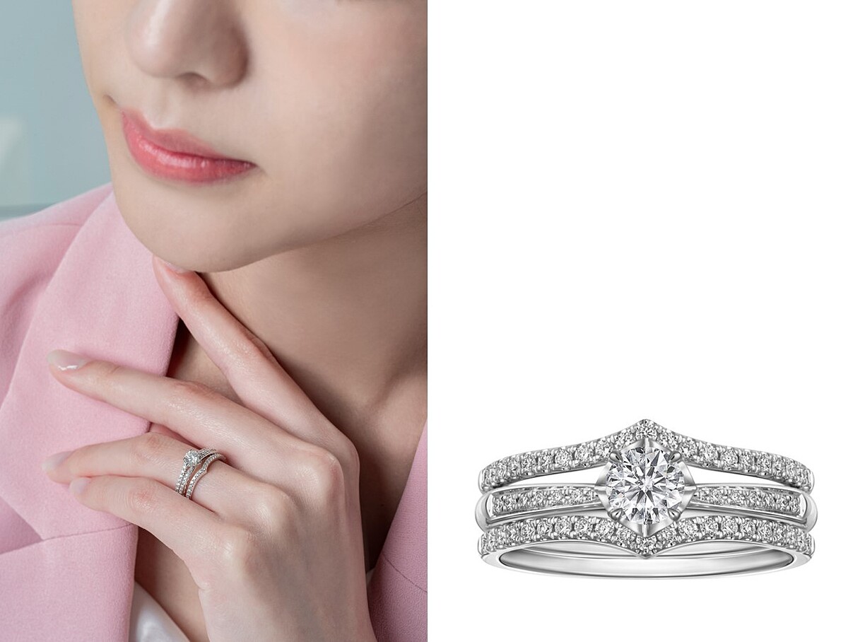 高低反差的立體線條設計,透過K白金完美勾勒在主鑽兩側呵護,整體概念完美展現了將戀人之間緊密的聯繫,輕聲密語傳遞彼此獨有溝通默契,呼應以專屬彼此的情感滋養發酵,進而散發出耀眼的幸福光芒寓意。