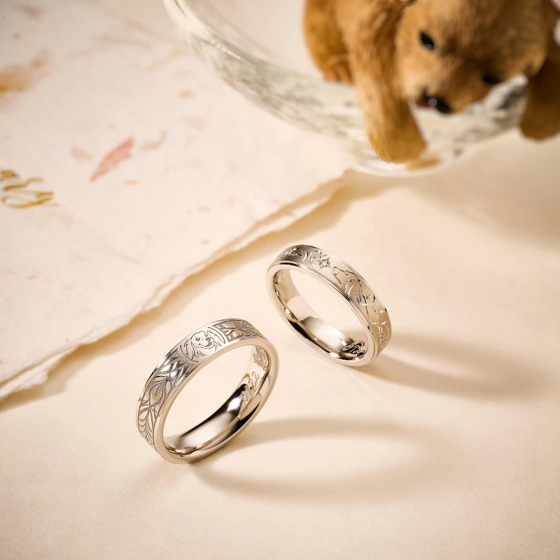另一組狗狗主人所訂製的對戒,則以簡約素雅的戒款搭配細膩鑿刻面容及圖騰打造而成,寬系的戒面分別以正面、側面的狗狗姿態展現,易於日常配戴融入各種造型穿搭,甚至與其他戒款堆疊混搭出層次感都沒問題,足見訂製設計上的高級審美有多優秀。