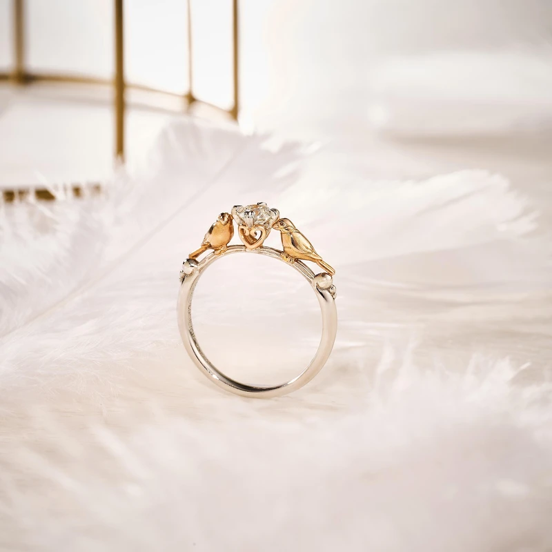 鳥類寵物家人的訂製同樣讓M編一看就讚不絕口,立體豐潤的身形輪廓,主鑽鑲嵌於愛心戒檯上,金銀雙色融合出輕盈靈巧的細膩風格美戒,滿足顧客需求之餘也突顯了用心的美感藝術規劃,完整地傳遞品牌在訂製珠寶工藝上的卓越及不凡。