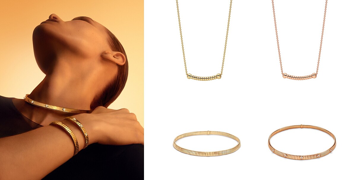 分外靈活、倍添柔韌的珠寶創作,將以成套形式呈現,包含中央點綴 Tubogas 元素的項鍊,以及光滑柔韌的項鍊,亦可選擇素面黃K金或前衛鑽石鉚釘頸鍊款式。