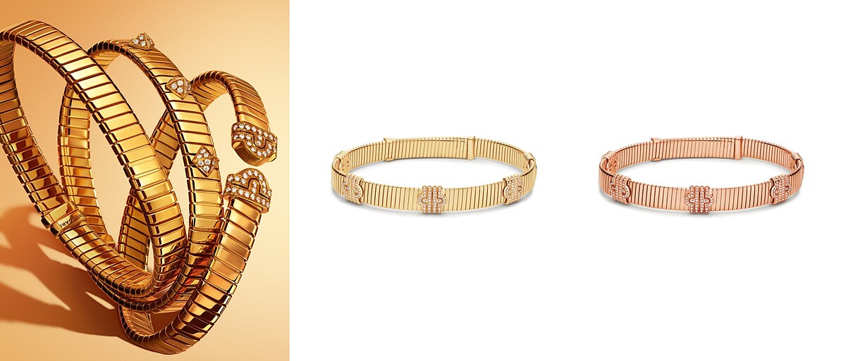 系列作品包括四款手環,均由金屬條環繞交錯而成,未經任何焊接,展現出獨特的工藝,同時為品味各異的藏家提供多種選擇,包括黃K金基本款、時尚的三金款,以及一款鑲有現代感十足的耀眼鑽石款式。新作兼顧了舒適度與視覺效果,在當代風格與工藝傳統之間絕妙取捨,無論單獨配戴或是搭配其他寶格麗系列均各有意趣