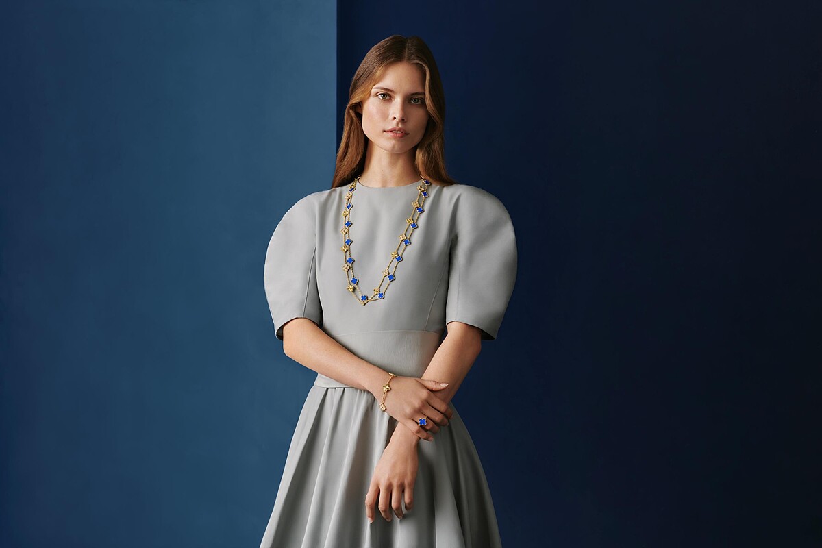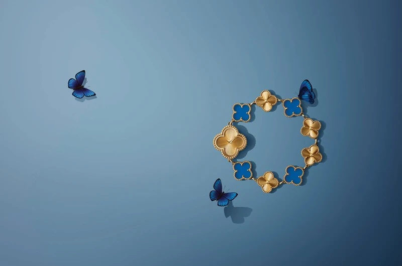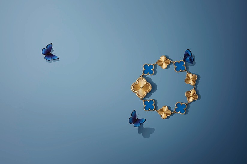全新Alhambra系列則是將1989年首次Alhambra系列鑲嵌藍瑪瑙後,再次回歸呈現,契合世家嚴謹標準的半透明藍色玉髓,有著無瑕淨度、鮮明色彩和表面光澤的上乘等級,加上工匠細心配對每一枚四葉幸運圖騰,經由寶石天然透光度呈現微妙差異,為作品鍍上獨一無二的魅力,綻放其獨特之美。