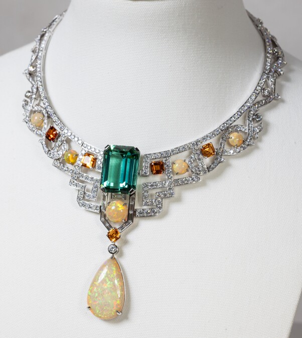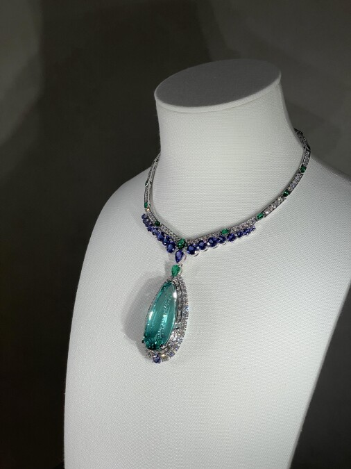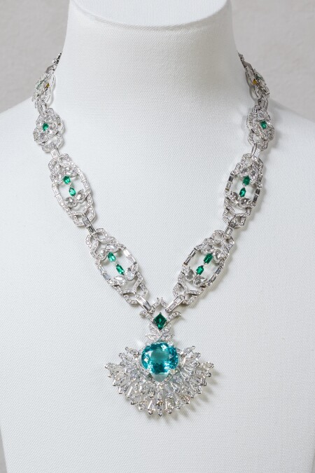 本場最大克拉數的作品為這條綠色碧璽項鍊,懸掛主石113.35克拉的長水滴型綠色碧璽,令人相當驚艷,並可將吊墜拆卸下來,轉換成胸針使用。