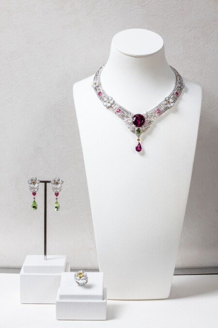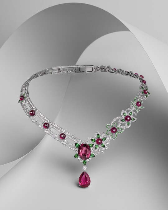 2024 Gucci高級珠寶系列中最具象化主題、也最具記憶點的,則要看到這款白金項鍊,上方飾有雙主石:28.07克拉尖晶石和14.91克拉紅寶碧璽,並有沙弗萊石、鑽石點綴其中,兩側不對稱設計融合花卉形象與G字母標誌,彰顯理性與感性的收放,完美掌握住視覺平衡與美感,同時體現了繁華的義式浪漫風格。