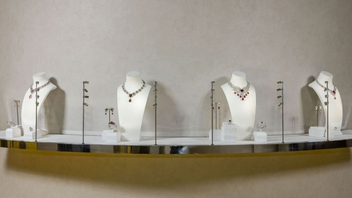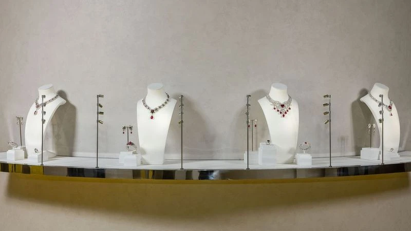 此條紅寶碧璽花朵項鍊亦是搶先全球、在台首度曝光的焦點作品,當中運用了和諧的對稱造型、對比的寶石顏色,G字母化為迷宮組成項鍊本身,並有白色立體花朵的間隔點綴,下方吊墜設計為可拆式,裝上或是拿下氛圍立刻轉變。