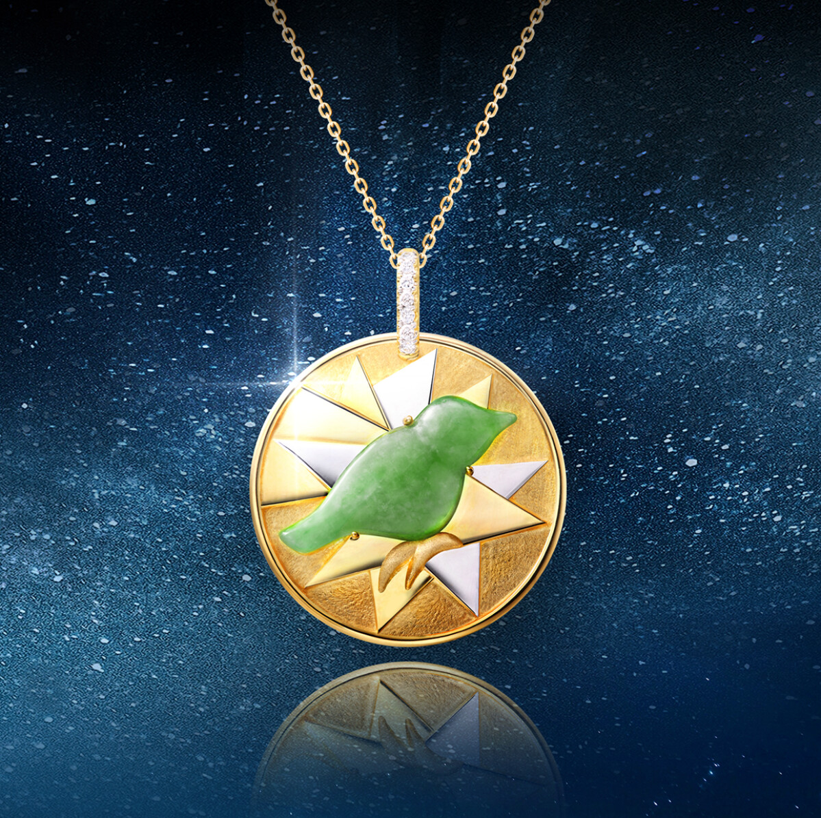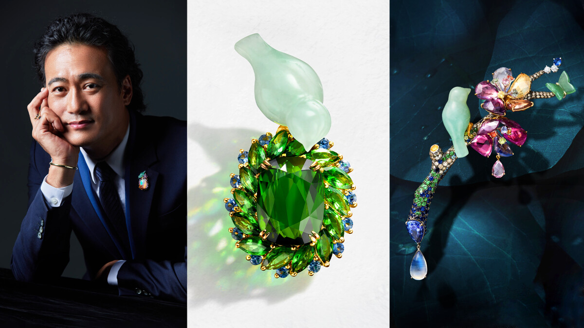林曉同設計師擷取一抹京都靜謐秋色,存放於「曉夢花園·京都印象」作品中。山脈被湛紅與金黃的漸層渲染出浪漫的楓葉美景,透過蛋白石的虹彩游動與彩寶的交織,勾勒出青鳥佇立的夢幻意境,捕捉“一葉知秋”的細膩情懷,將其化為永恆。而「曉夢花園·綠漾」則以綠碧璽與沙佛萊石展現山林的綠意和湖邊夜色的波光瀲灩,藍寶石如同清晨的露珠點綴其間,幸福青鳥俯瞰深邃美景,為作品注入令人嚮往的生命力。