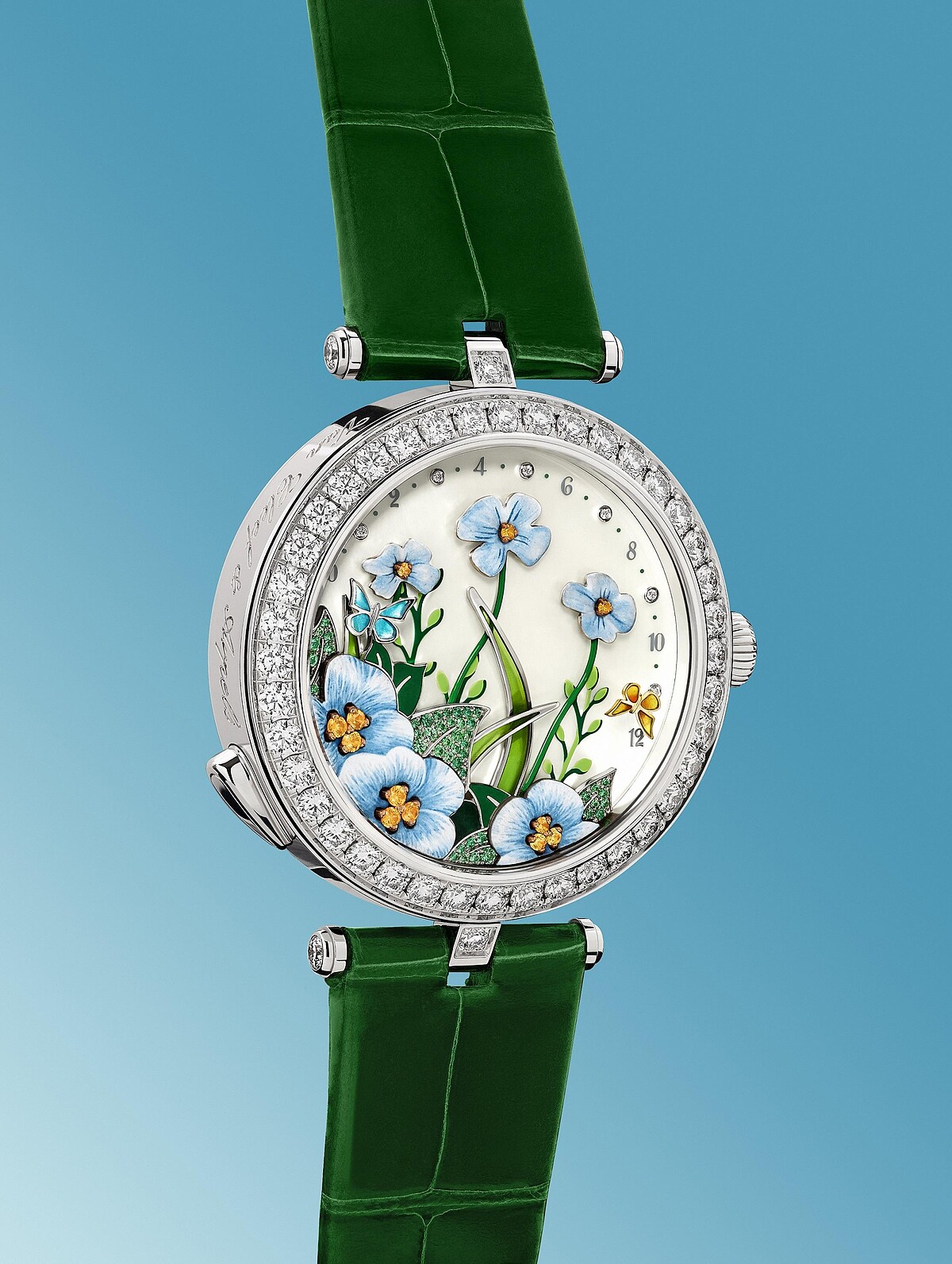 精緻絕美的Lady Arpels Brise d’Été腕錶,散發出仲夏清晨時分開遍Van Cleef & Arpels梵克雅寶花園的花卉美態,建構出如不凡藝術作品的微觀世界,令人讚嘆值得典藏。透過珍珠母貝錶盤呈現欣欣向榮的自然園林美景,天藍色丘陵琺瑯花瓣以微型彩繪琺瑯的細膩筆觸,渲染出漸層變化色彩;錳鋁榴石花蕊點亮纖麗花冠,加上鑲嵌綠鈣鋁榴石的葉片,錶盤上如詩般景致畫作,彩繪玻璃琺瑯野草點綴其中,令構圖錯落有致、層次鮮明,盡顯世家精湛細膩工藝。