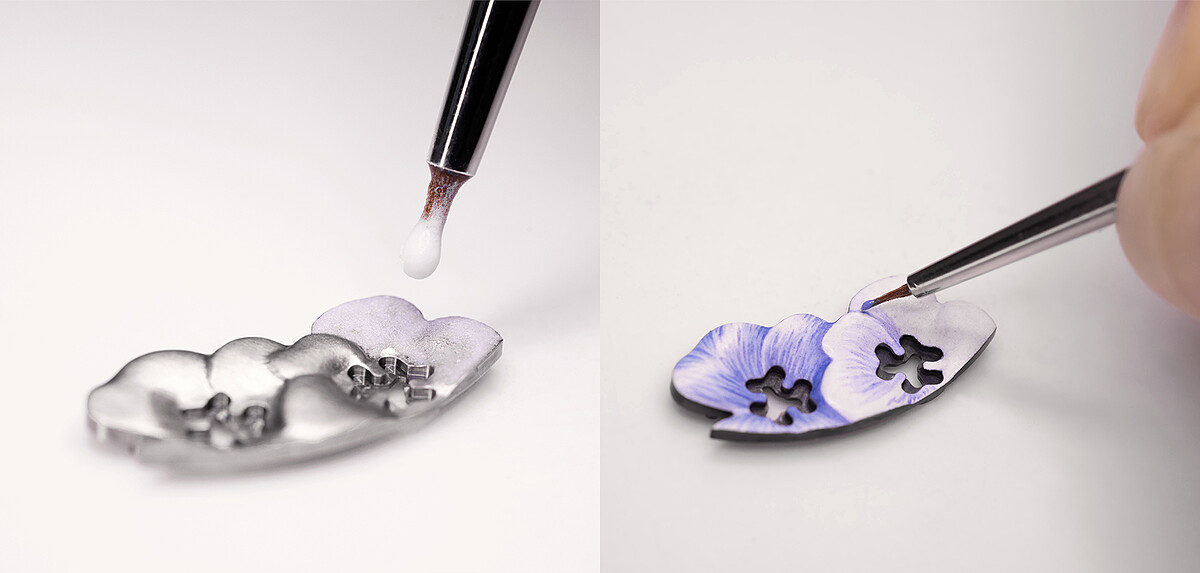 1. 以丘陵琺瑯工藝技術為花卉填上釉彩
