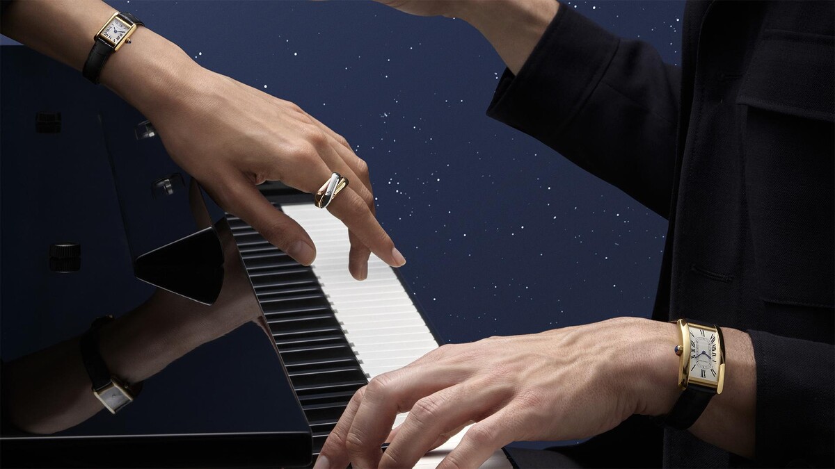 於19、20世紀交會時興起的爵士樂,蘊含了咆嘯年代獨特的張揚和活力,節奏明快且具有凸顯音樂家個性的即興精神。約莫在同個時期誕生的Tank腕錶,同樣濃縮了那個時代的美學精髓,卡地亞家族傳人Louis Cartier捨棄當時腕錶大行其道的渾圓線條,以俯視坦克車為靈感得來的長方造型,造就出浸潤裝飾藝術風韻的永恆經典。