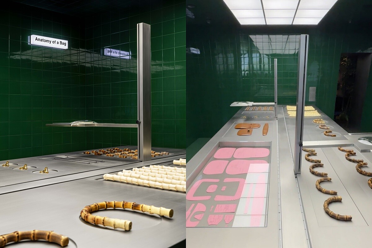走入下一展區,彷彿置身一座設計與科學融合的解剖劇場,這個展間將Gucci Bamboo 1947系列竹節包款歷經十三小時、四百多道工序的誕生步步剖析,展場中央,一座猶如實驗台的展示裝置將包款拆解為細部組件,搭配上方的潛望鏡俯視,細品每一縫線、皮革紋理與竹節手柄的精細製程,而這樣的空間設計在編輯與2050+設計團隊的空間設計師之一的Nils Grootenzerin深入瞭解後得知,會以解剖台的形式呈現包款結構,是為了在時尚設計中以理性角度展現出對比的趣味性,也能更加一目了然經典的竹節包在細節上的投入。