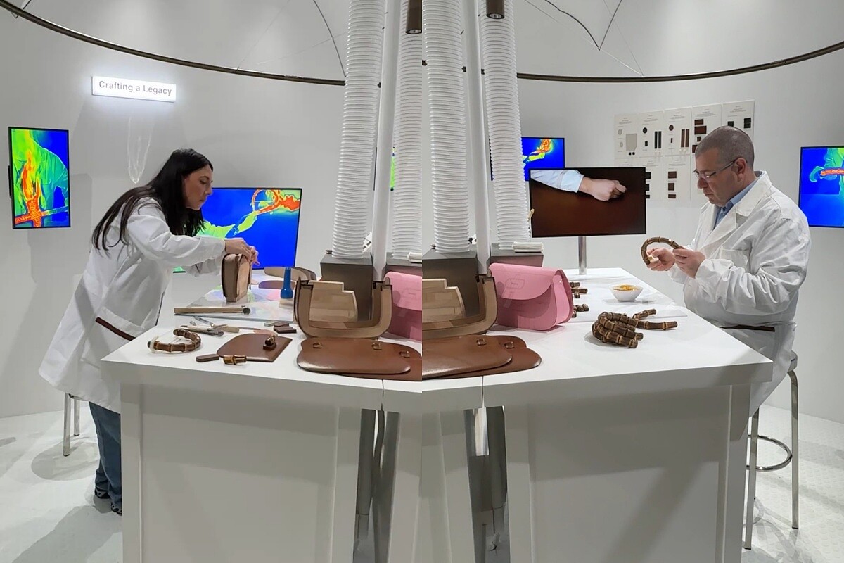 如果說包款的外形是視覺語言,那麼工坊的火光便是其靈魂,在包款解構之後看到的是Gucci特別邀請了兩位工坊工藝師前來,還原義大利佛羅倫斯Gucci ArtLab的工坊場景,重現竹節包誕生的現場,而因為展場為古蹟無法使用明火設配,所以竹節提把燒製的過程則是由Davide Rapp執導的影片展現工匠操作的韻律——包括火焰烘烤、蒸汽塑形、手工雕琢,每一根竹節的弧線都是透過雙手與本能直覺雕塑而成。