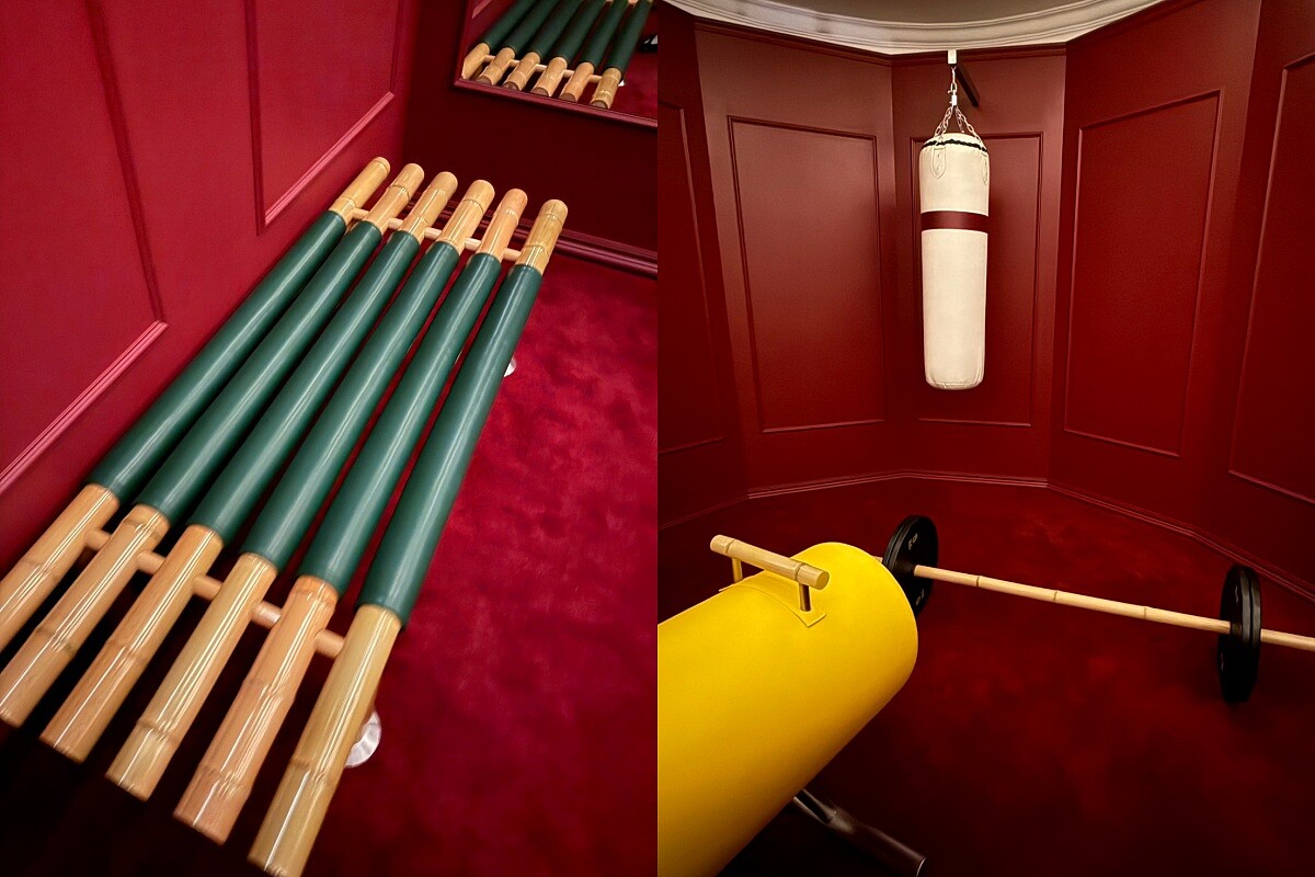 展覽尾聲,一座充滿趣味的空間令人眼前一亮!Gucci將竹節手柄重新想像成運動場域的功能裝置,在一座優雅復古的健身房場景中,竹節成為運動器械的一部分,展現出嶄新樣貌。