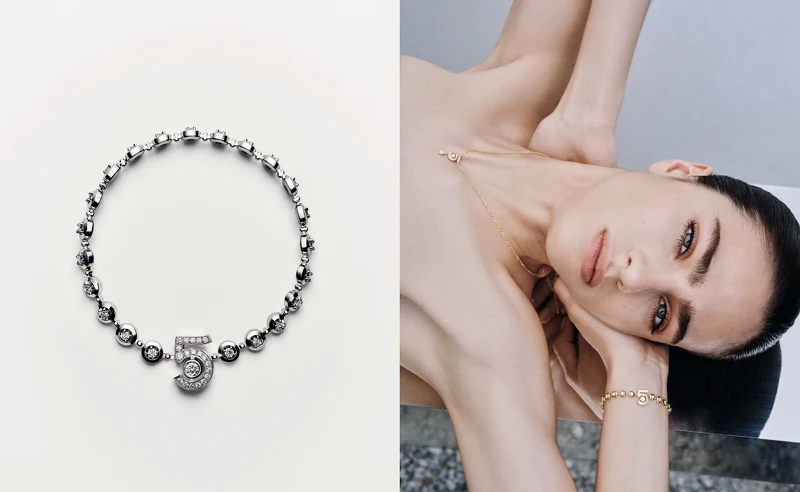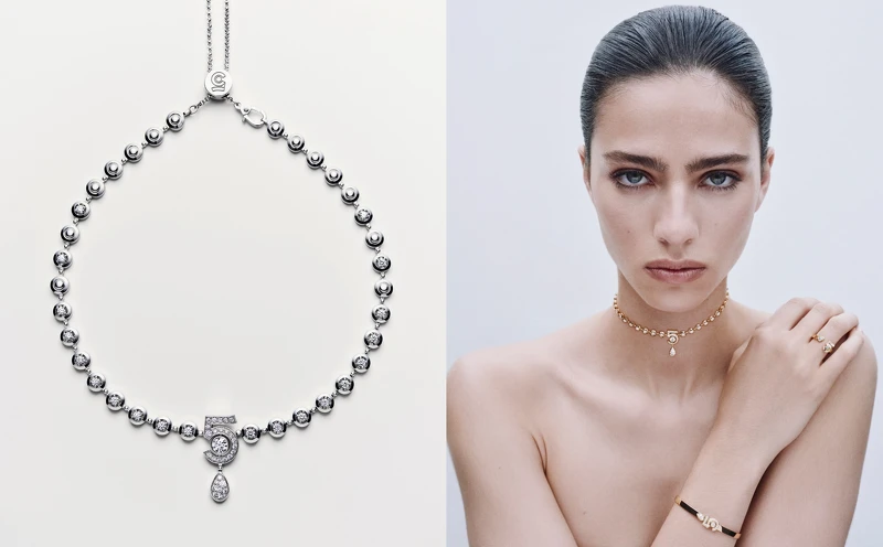 延續N°5頂級珠寶創作,同年推出N°5高級珠寶系列,於今年全新問世的頸鍊與手鍊,同樣沿襲了「5」的不朽精髓,採用18K金、18K白金或Beige米色金為材質,以受N°5香水瓶設計啟發的鏡面拋光斜切工藝,雕琢出一道有著緞帶光澤的流暢線條。致敬品牌1932年「Bijoux de Diamant」系列頂級珠寶的圓形明亮式切割鑽石,不僅出現在數字中央,更密鑲排列於模擬香水滴落美態的水滴圖騰之上。轉化挪用的超凡演繹,不言而喻地塑造出香奈兒標誌性的女性形象,也讓珠寶成為一種與自己對話的私密儀式。正如王渝萱所說,佩戴N°5系列不一定是展現耀眼自信的外顯手法,亦可昇華為強大心緒的內在能量。