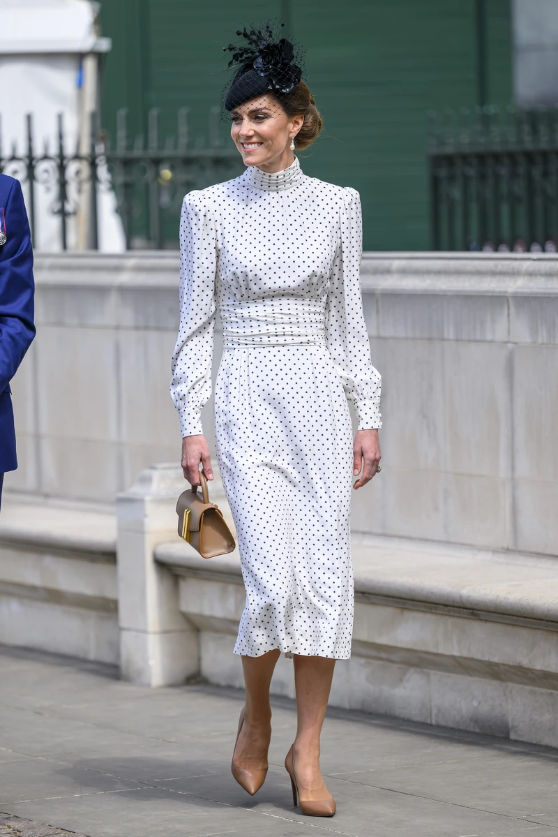 2025歐洲勝利日活動上,凱特王妃選擇這件復古剪裁的Alessandra Rich白底黑點點洋裝,這在2023 嘉德勳章儀式中上也穿曾經穿,禮帽上的羽毛也悄悄呼應花紋。