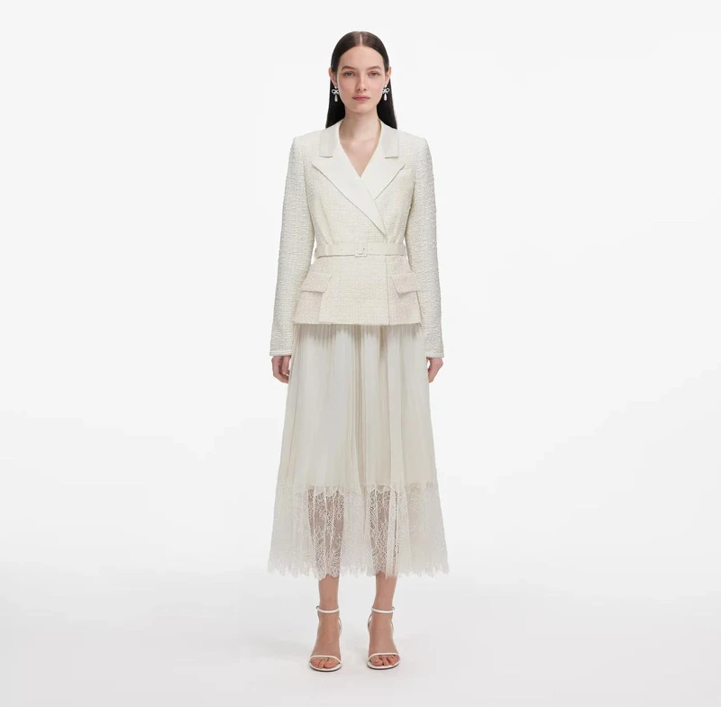 這件讓凱特王妃在這麼短時間內穿上兩遍的洋裝,為來自英國品牌Self-Portrait的設計,由馬來西亞設計師Han Chong於2013年創立,品牌現代優雅的剪裁設計深得明星、皇室、名媛的心,輕奢定位是許多女孩們心中的輕婚紗首選。而凱特王妃的衣櫃中已有多套的Self-Portrait造型,這次這件洋裝結合了正式感的束腰西裝,與浪漫風情的蕾絲裙襬,讓整體造型不會太生硬,高雅又易於搭配,難怪凱特王妃馬上就穿上第二次!