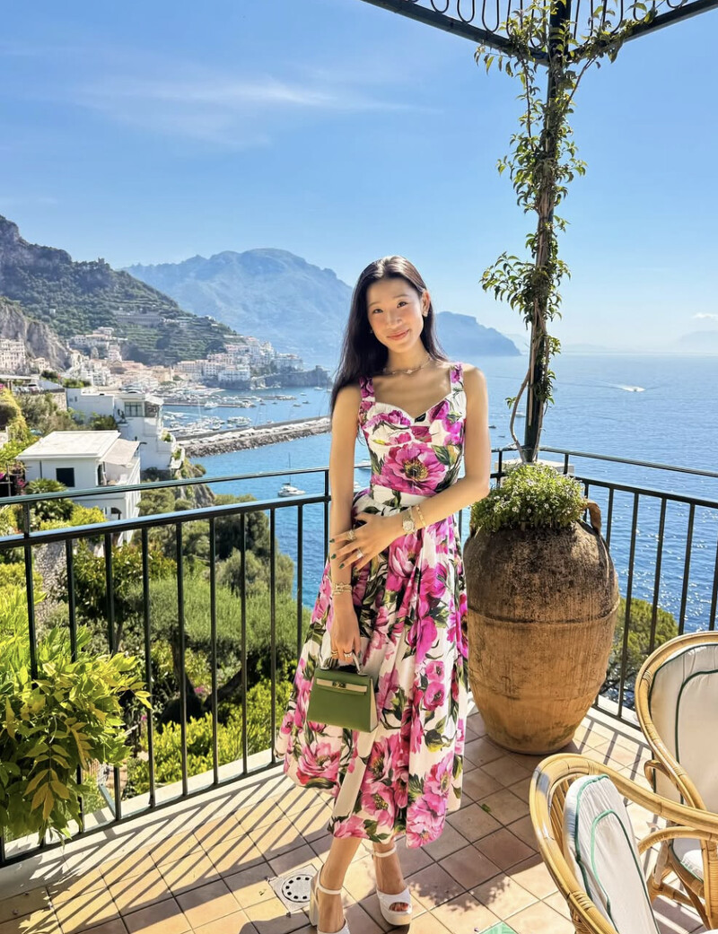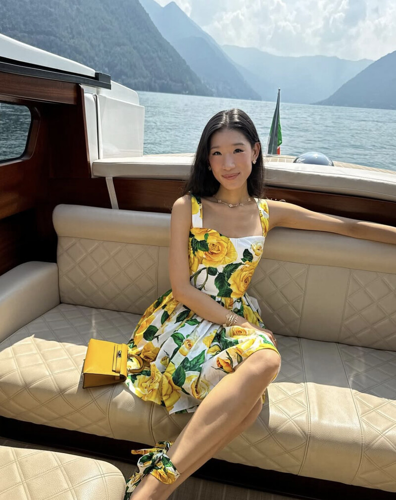 RichTok象徵:科莫湖本就是富豪度假勝地,Becca Bloom一身陽光色彩呼應湖面波光粼粼,完美形塑奢華風格。