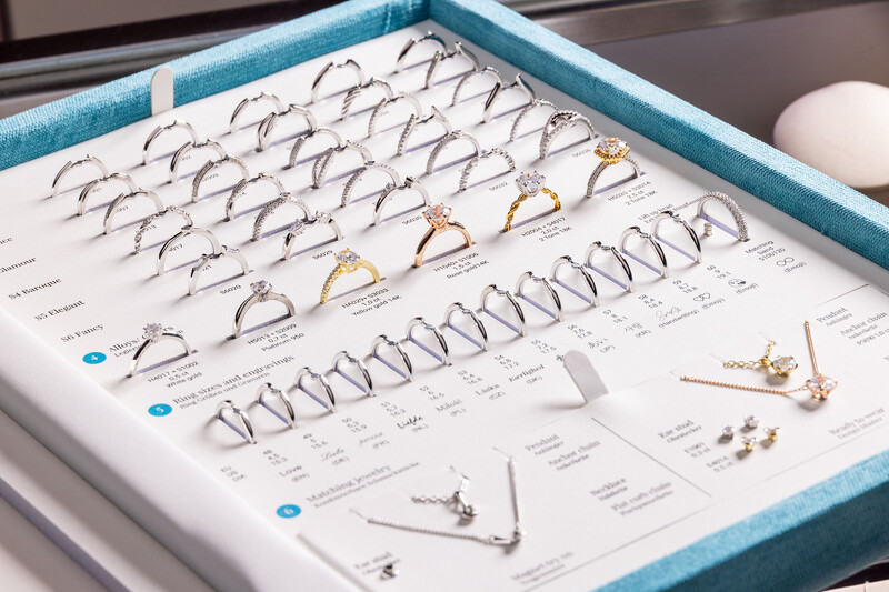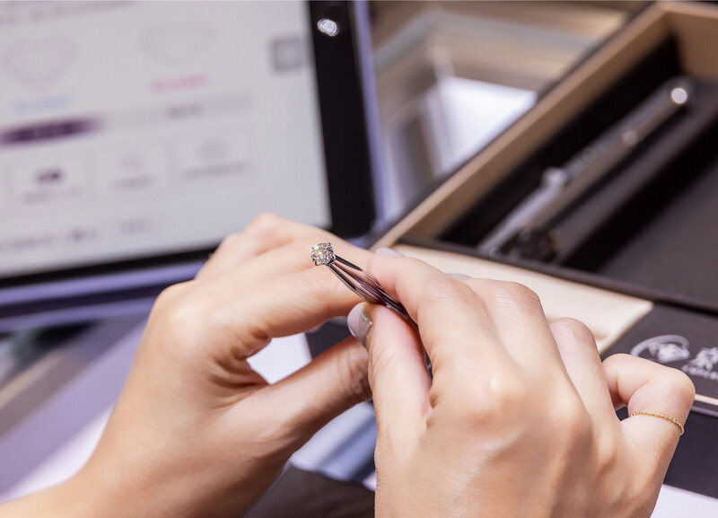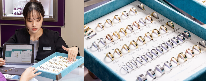 以求婚鑽戒或結婚對戒來說,會先透過完善的3D客製化程式,挑選心儀的鑽石及鑲嵌方式、選擇喜愛或適合自己膚色的金屬材質、依照骨架與手指粗細決定戒圈尺寸、決定戒圈的細節如款式、紋理、槽線、是否舖鑲鑽石與刻印服務等細節,一步步選定完成後透過3D模擬繪製出成品的樣子,接著只須等待42天便能收到作品,可說是業界最快的客製化設計。