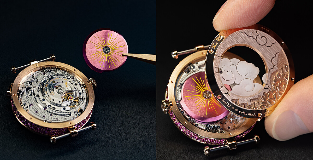 經過四年間孜孜不倦的研發,世家造就一枚搭載自動機械裝置的新機芯,自動裝置一經驅動,一雙戀人便能流暢自然向彼此靠近,機械裝置必須足夠精微細緻,設計巧妙極緻,才能如此隱身於錶盤的裝飾元素下。