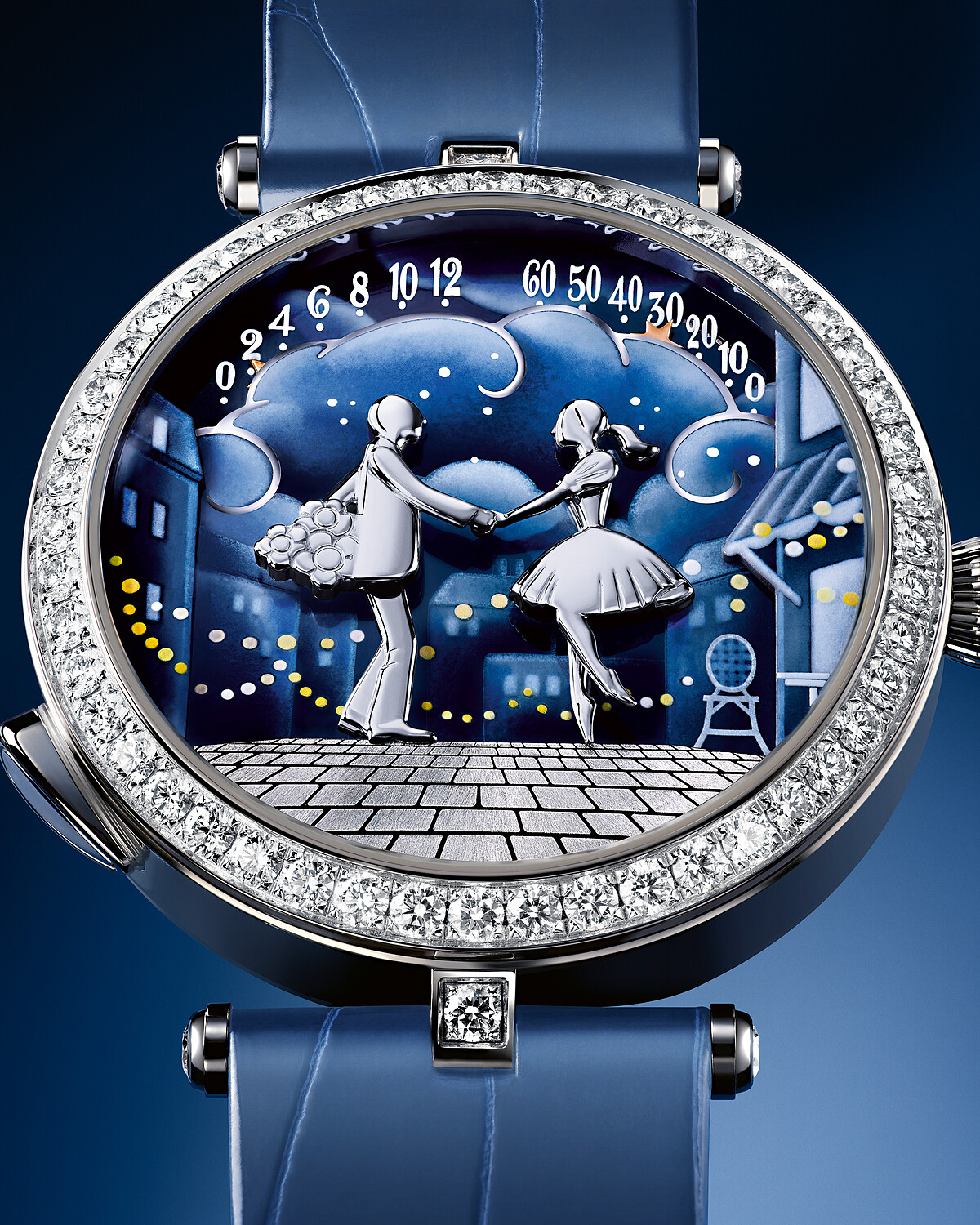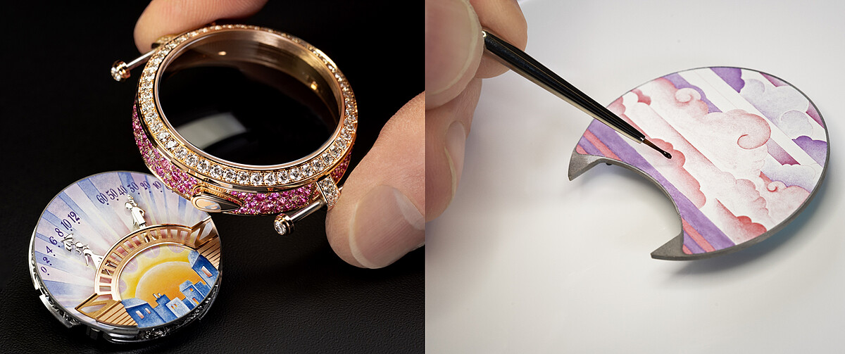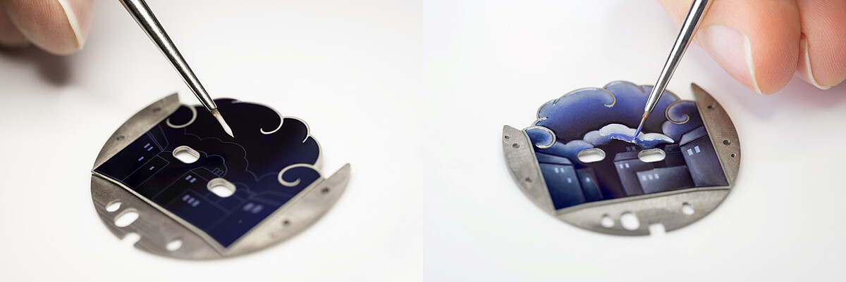 Lady Arpels Bal des Amoureux Automate錶盤上的墨彩琺瑯,則是傳統的métier d’art匠作藝術,這項精確技術始於16世紀的法國,描繪過程十分講求匠心與耐性,珍罕的墨彩琺瑯在Lady Arpels Bal des Amoureux Automate腕錶上花開兩朵,分別展現出傳統灰階墨彩和彩色墨彩,兩種截然不同的手法。前者由工匠於深藍背景上填入白色的「利摩日白釉」(blanc de Limoges),彰顯對比效果;後者以深淺不一的藍色釉彩,加強構圖層次,再以溫煦的黃色釉彩點上和暖燈光。如此細緻的琺瑯加工,需耗上40小時,窯燒工序歷數十次,方能呈現錶盤上的動人風景。