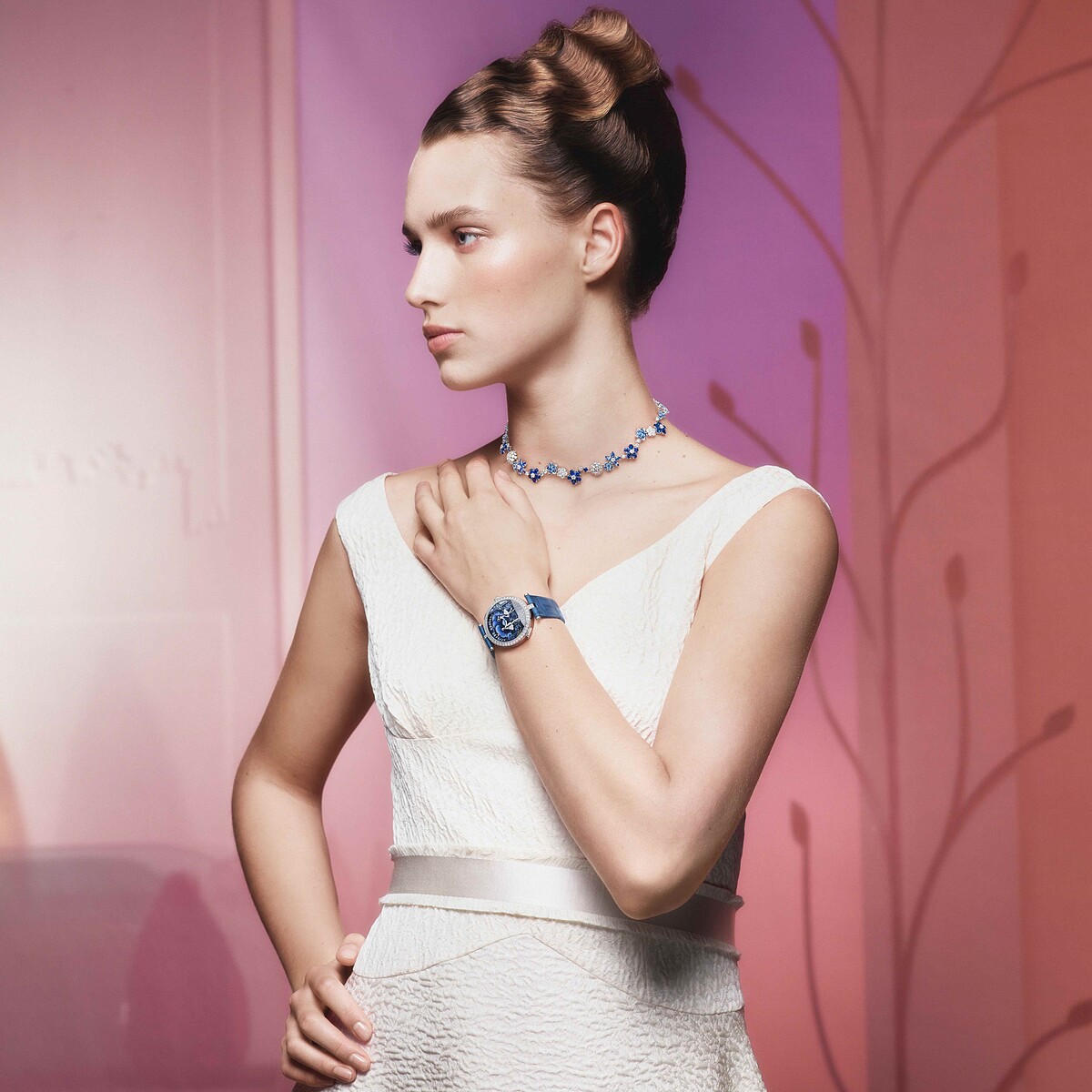 錶盤透過墨彩琺瑯工藝將相逢景緻完美呈現,有如一幀色彩豐富的水彩畫。前景中的拱橋剪影以精金雕琢而成,與後方的景致構成立體的透視效果。腕錶底蓋則以藍寶石水晶鏡面上的琺瑯印花和金質鐫刻工藝。腕錶搭配了鑲鑽珠寶錶帶,Aube和Soirée分別在錶帶鑲飾粉紅色藍寶石,呈現漸層變代的色彩;Matinée和Clair de Lune則各於錶帶鑲嵌淺藍至深藍的漸變色藍寶石,加上細緻絲網結構使錶帶柔軟靈活,緊貼手腕弧度,從視覺到配戴上的舒適度全面展現世家打造珍稀臻品的不凡工藝境界。